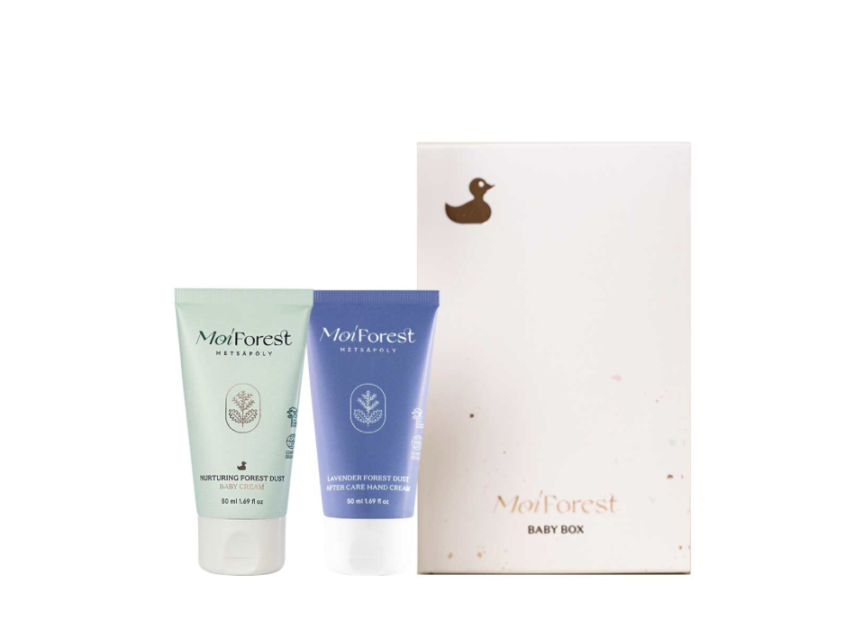 Moi Forest Baby Box on kaunis ja käytännöllinen lahjasetti, joka tuo helpotusta sekä vauvan ihonhoitoon että vanhemman arkeen. Pakkauksessa on kaksi jättisuosittua tuotetta: metsäpölyä sisältävä Nurturing Forest Dust Baby Cream sekä vanhemmille suunniteltu, mikrobiomia vahvistava Forest Dust After Care Hand Cream.